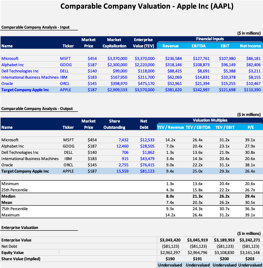 The Comparable Company Analysis (CCA) of Apple Inc. reveals that the company’s estimated enterprise value, based on four different valuation multiples, ranges between $3.04 trillion and $3.42 trillion. This analysis leads to a share price range of $190 to $ 203. These figures suggest that Apple Inc. is currently undervalued (Current Price $187 as of May 23,2024) and may have potential growth, supported by its consistent financial performance, market leadership, and growth prospects. These insights provide a strong foundation for making informed investment decisions, affirming that Apple Inc. is a valuable addition to any investment portfolio.